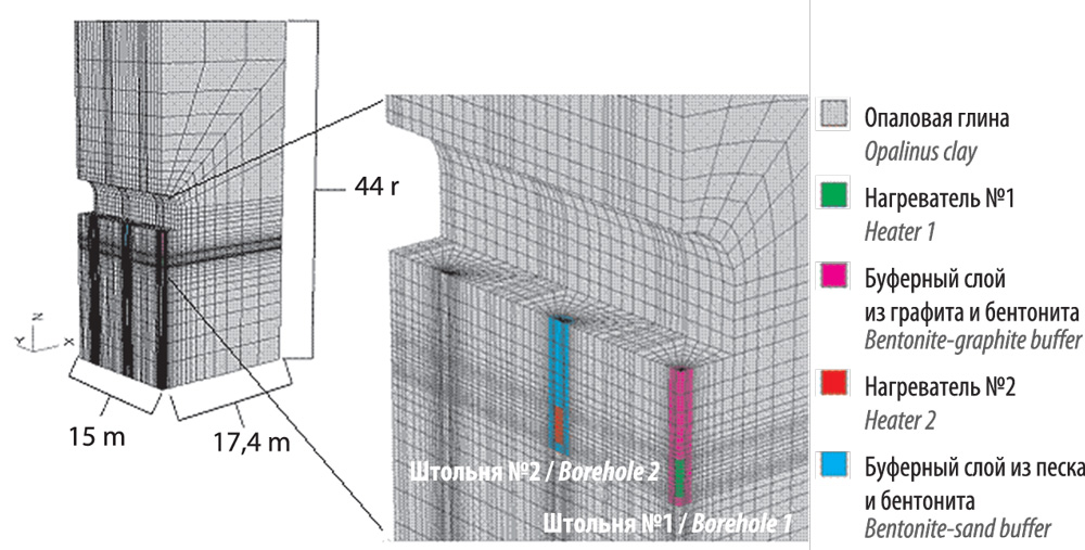 Компания DBE TECHNOLOGY использует программный пакет TOUGH2, а также другое программное обеспечение (в том числе собственные разработки) для создания современных компьютерных моделей, описывающих различные сложные гидрогеологические процессы, протекающие как в естественных, так и в нарушенных условиях. В их числе миграция газообразных и жидких сред, процессы и механизмы переноса радиоактивных частиц, термохимические взаимодействия природных и техногенных материалов и т.д. Такие параметры, как устойчивость геологической среды, механическая прочность, сейсмические реакции и состыкованность входных отверстий выработок, контролируются специалистами компании в натурных условиях, а затем анализируются научно-техническим персоналом с использованием кода FLAC3d, а также другого программного обеспечения, в том числе собственного. На рисунке 3 представлен пример трехмерной численной компьютерной модели, используемой для оптимизации теплового режима хранения в глинистой формации. Результаты моделирования процессов оцениваются и анализируются с учетом естественных свойств породы и характеристик инженерных барьеров и систем хранилища; в результате дается прогноз общей ситуации на площадке. Для моделирования возможных радиационных воздействий на людей и окружающую природную среду в нормальных и аварийных условиях используется программный пакет GoldSim.