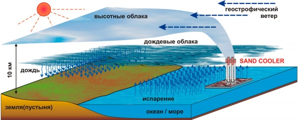 COOLER предназначен для использования неограниченных запасов пресной воды в виде пара в атмосфере над акваториями ближайших к пустыням морей.