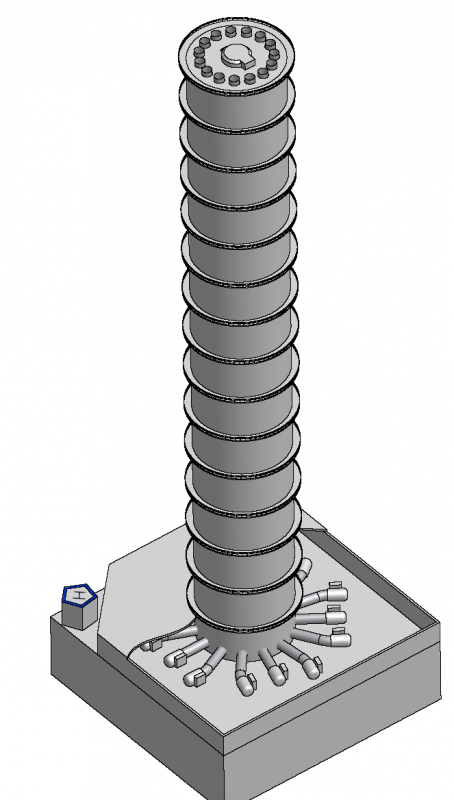Основу COOLERа составят инжекторы – пустотелые железобетонные сооружения цилиндрической формы высотой 400м и более, диаметром ~ 40-100м, содержащие электровентиляторные установки и трубные конструкции для подогрева и заброса увлажненного воздуха на расчетную высоту ~ 10км. На рисунке показан вариант COOLERа с 8 инжекторами.